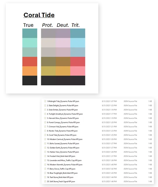 ✅ Dual Format Ready – Delivered in Excel (with HEX codes and previews) and JSON for instant use in Power BI or your design workflow.