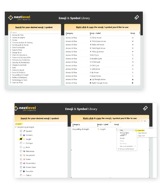 ✅ Searchable Power BI Report – A ready-to-use PBIX file where you can browse categories or search instantly, then copy and paste symbols directly into your dashboards.