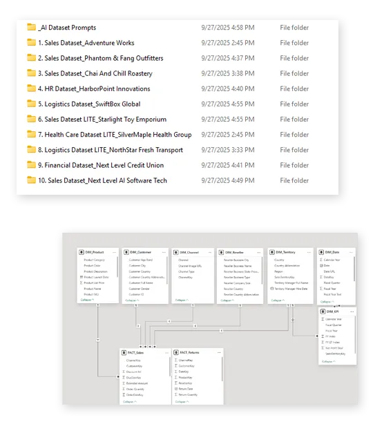 ✅ 10 Full Datasets – Covering Sales, HR, Logistics, Finance, and Healthcare, plus AdventureWorks.